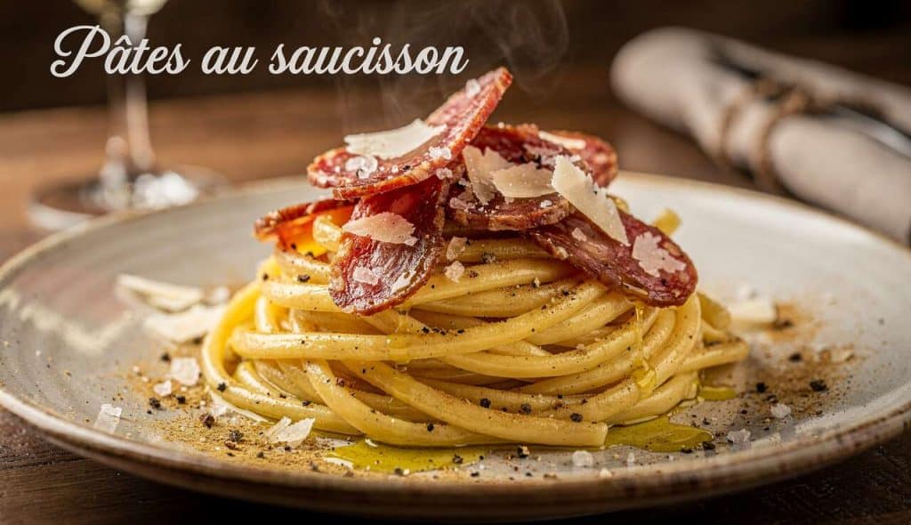 Les pâtes au saucisson sont une variante simplifiée des plats traditionnels italiens, offrant un goût riche avec un minimum d’ingrédients. Cette recette est issue des régions rustiques de l’Italie où les ingrédients locaux et faciles à conserver étaient privilégiés.