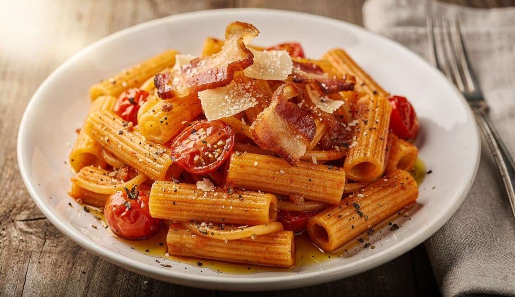 Les rigatoni aux tomates cerises et guanciale apportent une saveur riche et gourmande à votre table. Cet élégant plat de pâtes, issu de la cuisine italienne, marie subtilement la douceur des tomates cerises à la richesse du guanciale, cette charcuterie italienne faite de joue de porc. Préparez-vous à découvrir un plat qui séduira vos papilles et charmera vos invités.
